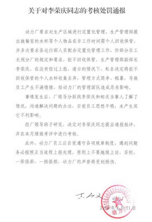 動(dòng)力廠一名工作人員提供的一份《關(guān)于對(duì)李榮慶同志的考核處罰通報(bào)》顯示,該廠生產(chǎn)管理部提出就餐室的水杯等個(gè)人物品在非工作時(shí)間由個(gè)人回收保管,但部分員工無(wú)視此規(guī)定和要求,拒不回收保管。李榮慶在沒(méi)有經(jīng)過(guò)上報(bào)請(qǐng)示的情況下,私自決定將拒不回收保管的個(gè)人水杯收集丟棄,管理方式簡(jiǎn)單粗暴,導(dǎo)致員工產(chǎn)生不滿情緒,給動(dòng)力廠的管理團(tuán)隊(duì)造成惡劣影響。